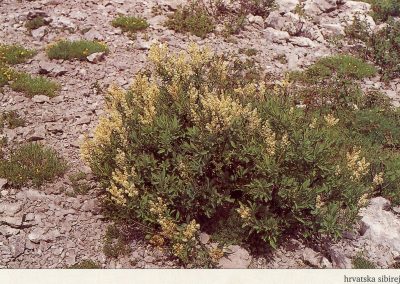 Slika 2. „Hrvatska“ sibireja na izvornom nalazištu (locus classicus), Velincu iznad Karlobaga. Ova je fotografija Darka Mihelja poslužila i za izradu jedne u nizu razglednica endemičnih vrsta hrvatske flore, koje je početkom ovog stoljeća izdavao Botanički vrt PMF-a u Zagrebu…