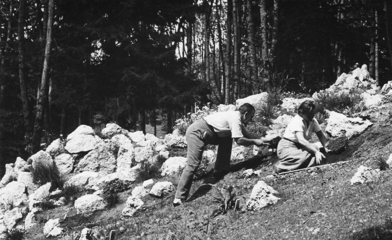 Slika 4. … a uzgajana je i u Planinskom botaničkom vrtu na Medvednici! Na ovoj slici vidite profesora Frana Kušana – osnivača nekoliko botaničkih vrtova – kako sa suradnicom sadi biljke na kamenjari tog vrta, otvorenog javnosti 1939. Do kraja Drugog svjetskog rata Sljemenski planinski vrt je zapušten. (Fotografija Borisa Vrtara iz 1937. Arhiva Botaničkog vrta PMF-a)