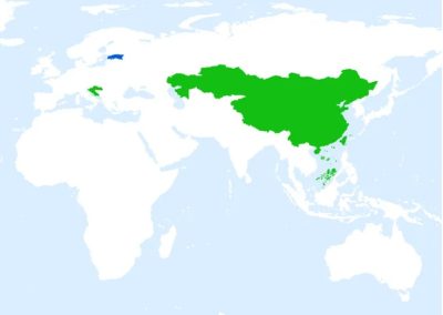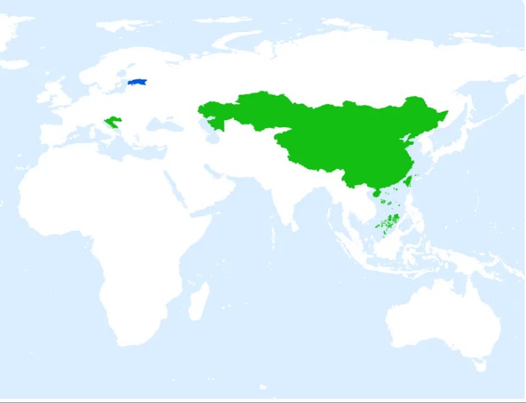 Slika 1. Današnja rasprostranjenost glatke sibireje prikazana na karti govori više od riječi: zeleno = prirodna staništa, plavo = udomaćena. Međutim, niti azijski areal nije tako „zelen“: i tamo postoje lokaliteti izoliraniji od ostatka distribucije (primjerice, Tibet). Preuzeto s portala PictureThis: https://www.picturethisai.com/wiki/Sibiraea_laevigata.html